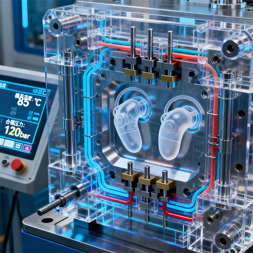 Plastinsprutning av hörapparater är en plastbearbetningsteknik där smält plastmaterial injiceras i ett exakt utformat hålrum i en hörapparatform under högt tryck. Efter att plasten svalnar och stelnar öppnas formen för att ta bort hörapparatkomponenterna. Genom denna process kan plastkomponenter i hörapparater produceras som har exakt samma form som mögelhålan.